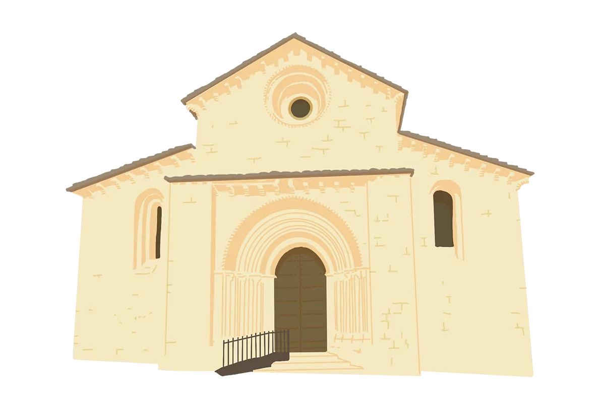 Accesos y portadas: El acceso principal se sitúa en los pies, con una portada occidental de medio punto, compuesta por varias arquivoltas apoyadas en columnas con capiteles decorados. Existe otra portada en la fachada sur de carácter más sencillo, y en el muro norte había un vano de acceso que hoy está tapiado.